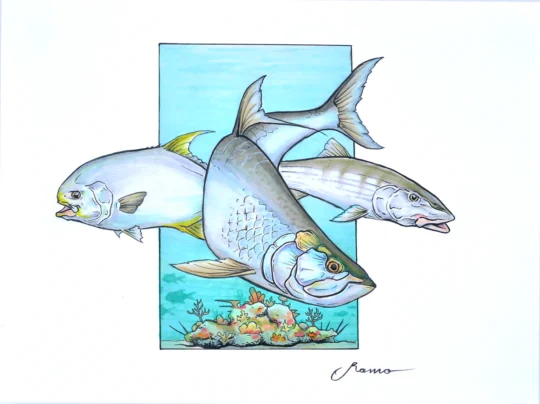 Bring a piece of the Florida Keys right into your home with this original drawing featuring the legendary “Grand Slam” trio; a tarpon, permit, and bonefish. These are the crown jewels of saltwater fishing, the species every angler dreams of landing, captured here with character and charm. Each fish is drawn with its own bold personality, making this artwork just as lively as the waters they come from.