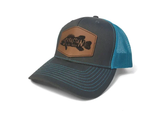 The Sebastian in the Wild logo hat features a laser engraved leather logo patch on a Richardson 112 charcoal/blue trucker hat. Perfect for any adventure out on the water or in the woods.