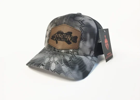 The Sebastian in the Wild logo hat features a laser engraved leather logo patch on a Kryptek Raid camo trucker hat. Perfect for any adventure out on the water or in the woods.