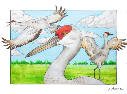 Drawn with ink and Copic markers on thick bristol paper. This composition of Sandhill cranes beautifully illustrates the various behaviors of these majestic and playful birds. The bird on the top left is seen gracefully flying doing his unmistakable call. The bird in the middle is a close-up portrait to highlight the beautiful details in their whimsical face, and the bird on the right is performing his elaborate, and often comical mating dance.