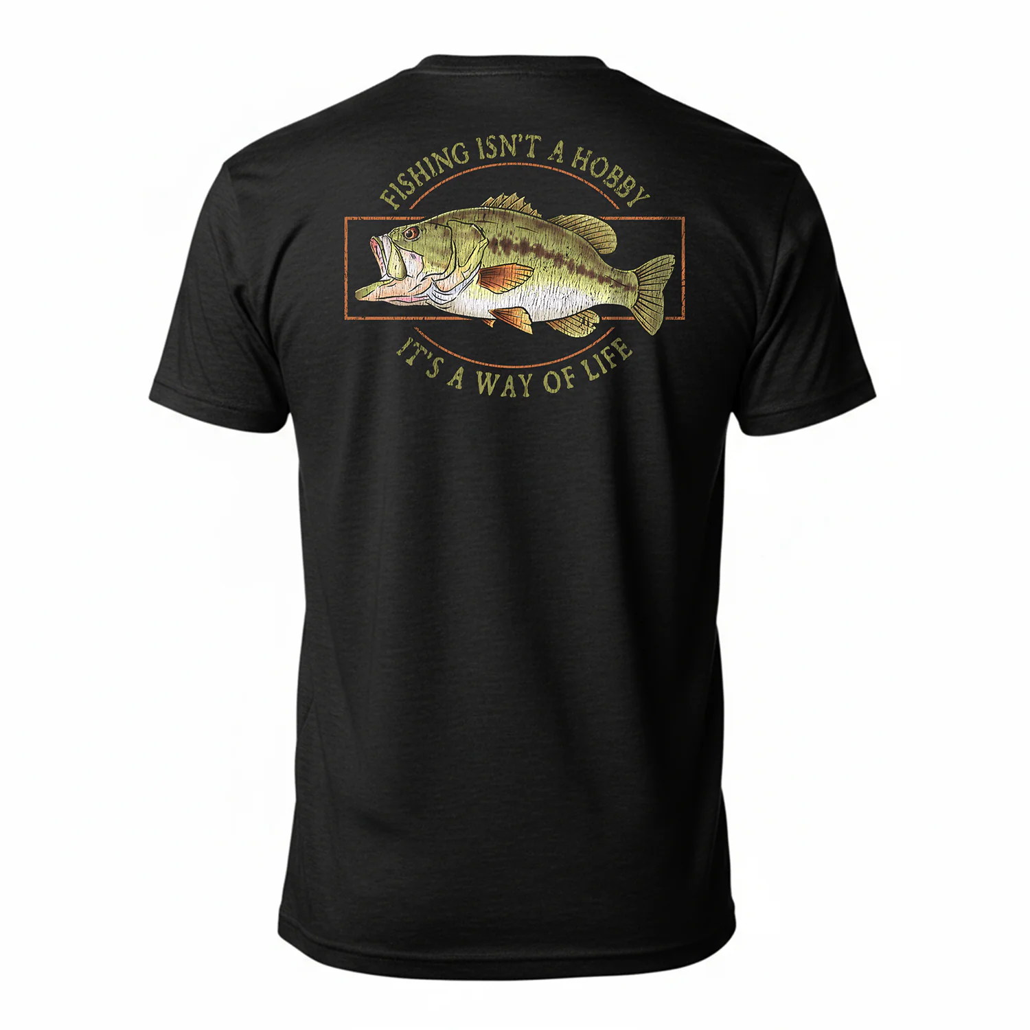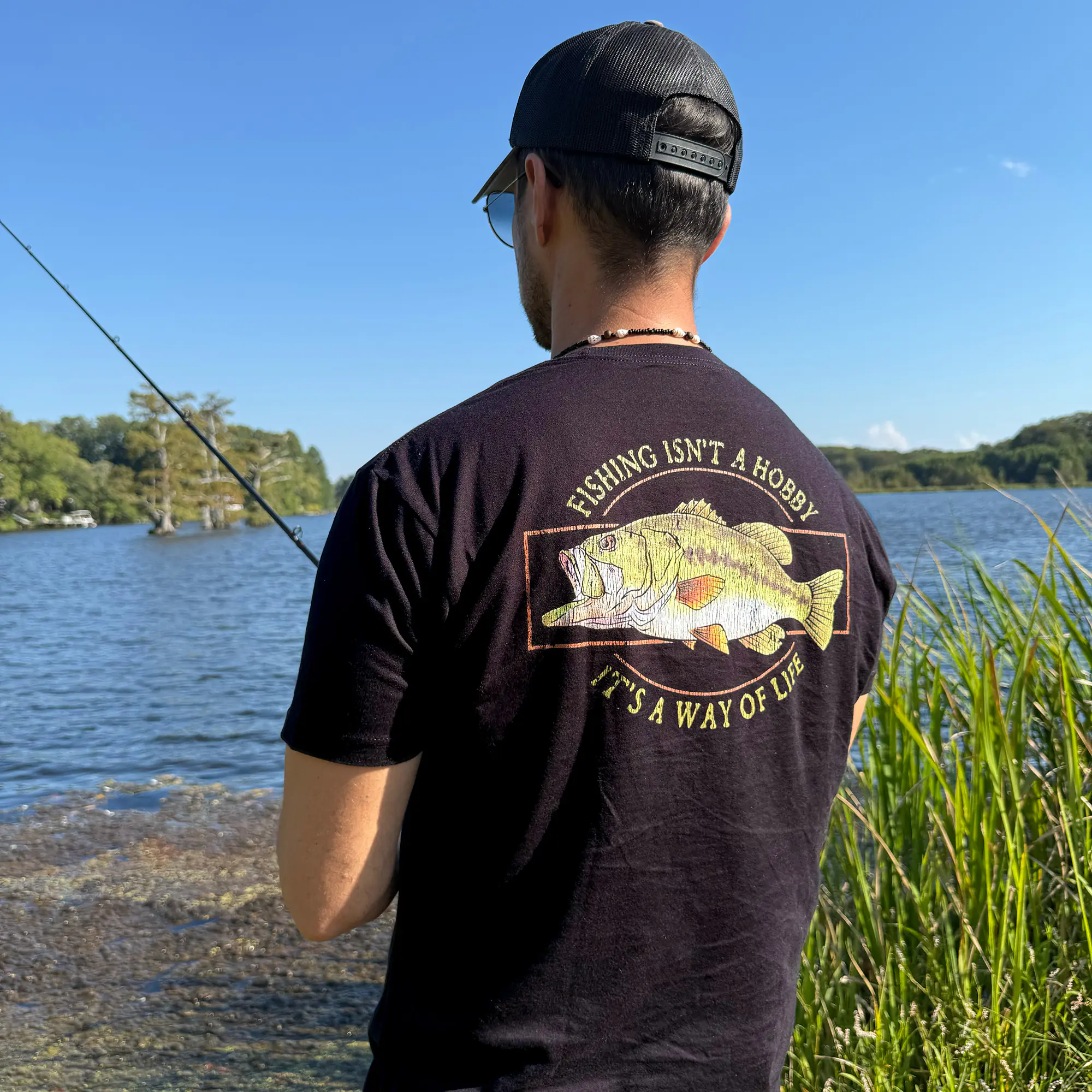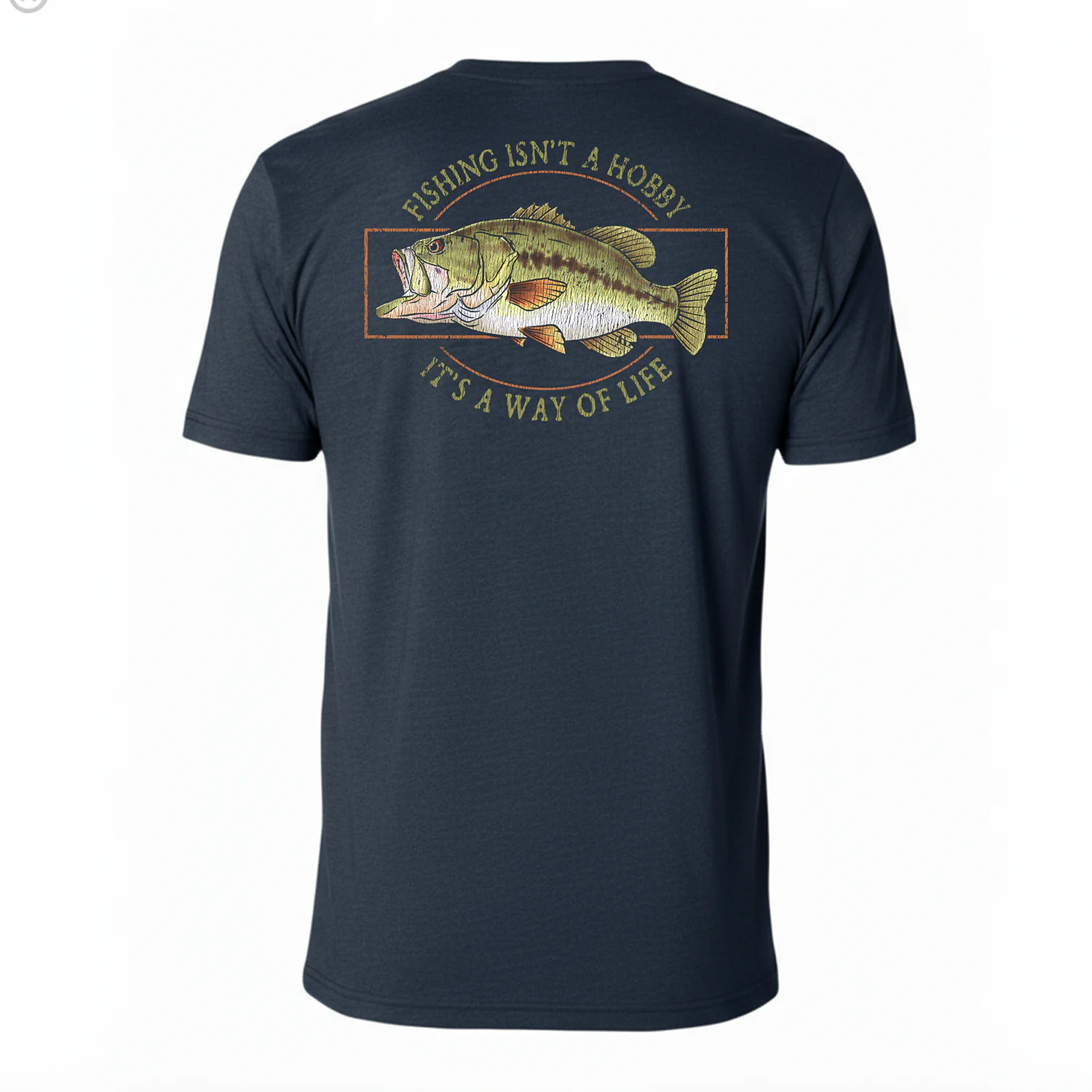 Hooked? Oh, you’re way past that. This isn’t just a t-shirt, it’s a badge of honor for every bass fisherman who knows that fishing isn’t “just a hobby,” it’s a full-blown lifestyle. Featuring a big, bold largemouth bass that looks like its about to strike your best lure, this shirt proudly declares what you already know: fishing is life, and everything else is just background noise.